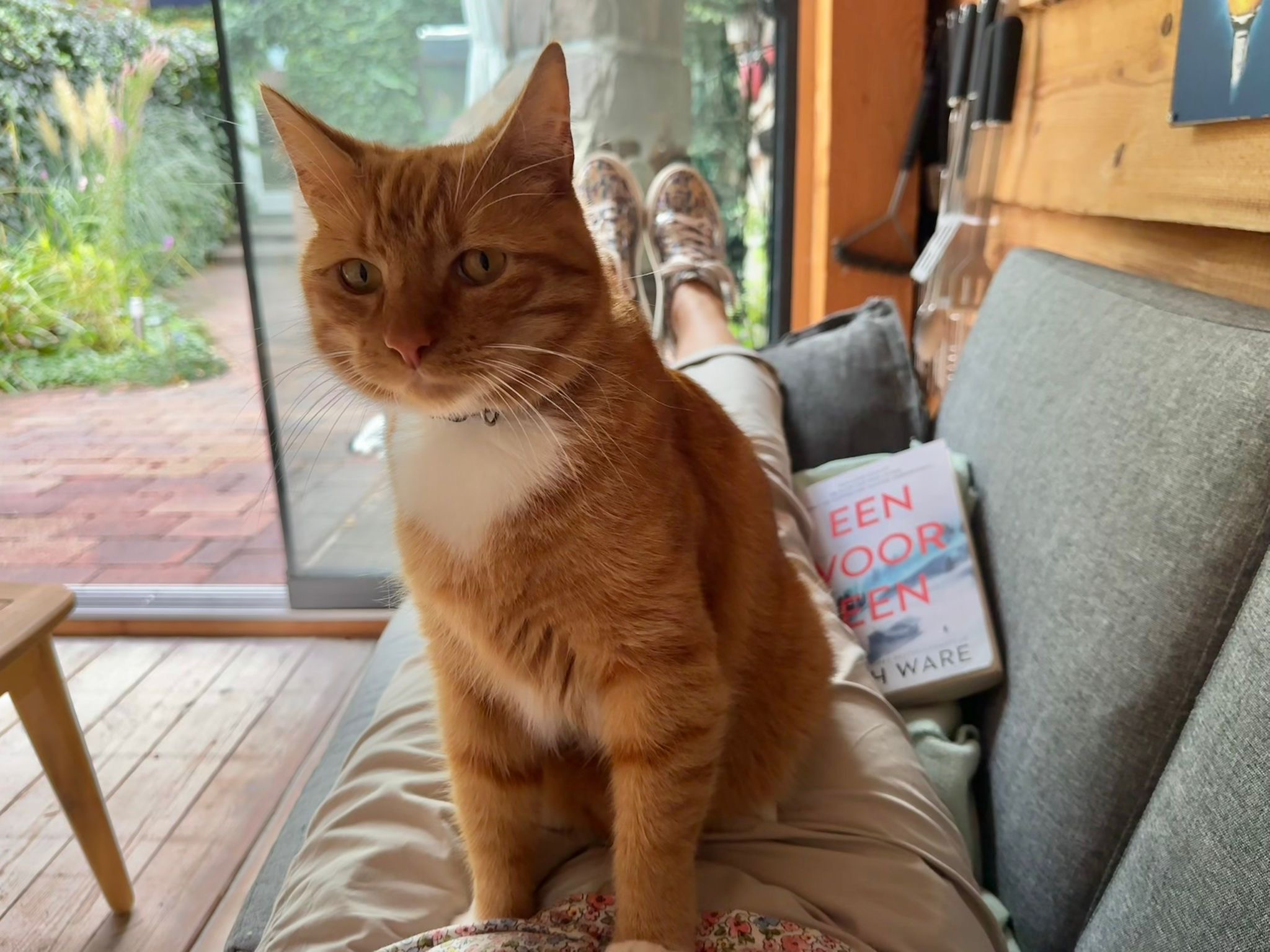 Thuis plof ik lekker met een boek op de bank en kroel met de poezen.