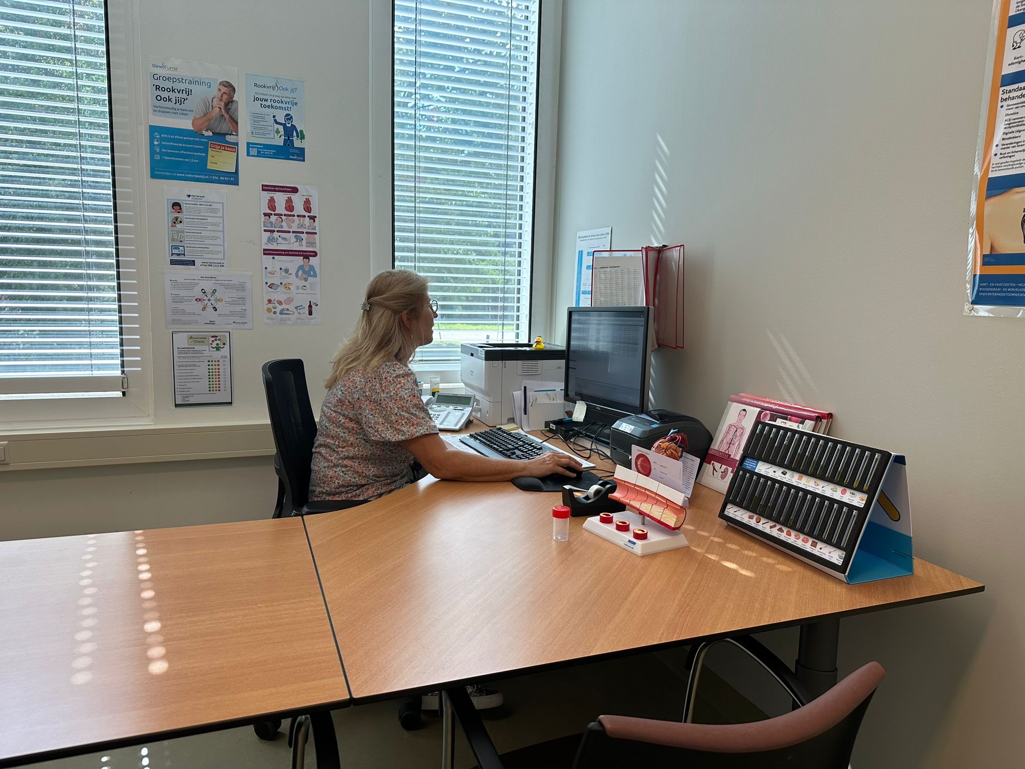 Dan volgen de intakegesprekken met nieuwe patiënten die komen revalideren. We bespreken hun situatie, maken een risicoprofiel en nemen de medicatie door. Ik meet de waarden, doe een zes-minuten wandeltest en verwerk alles in het dossier. Ook regel ik de verwijzingen naar de fysio, psycholoog of maatschappelijk werker.