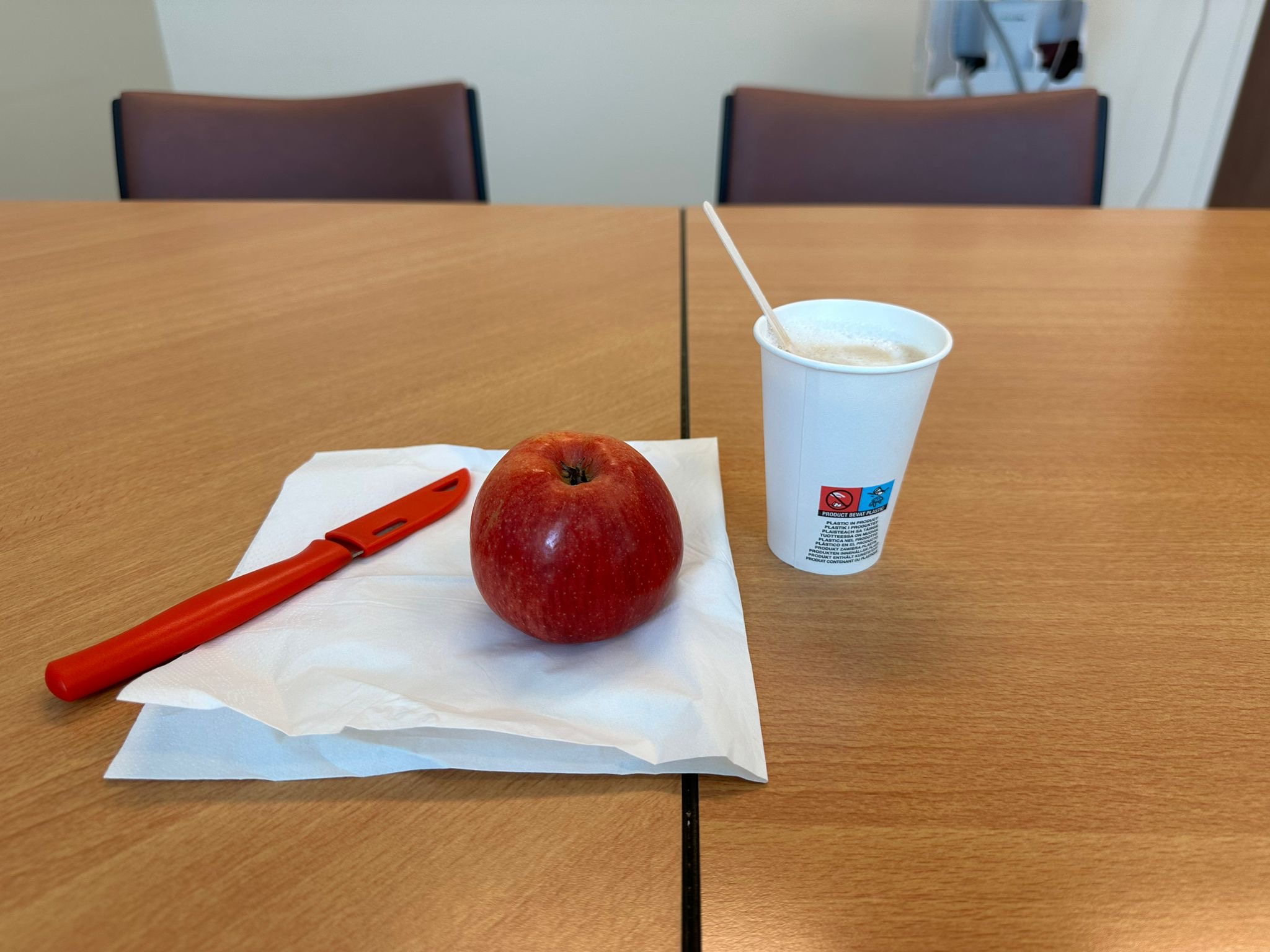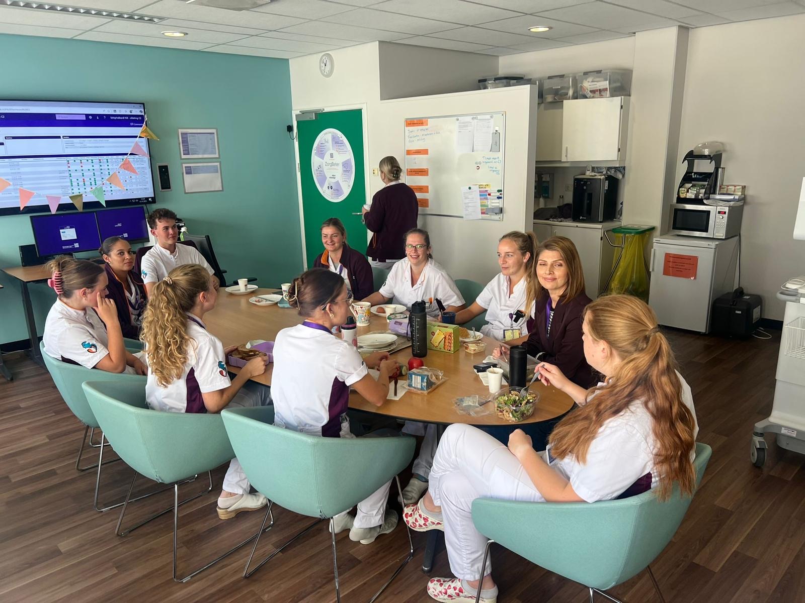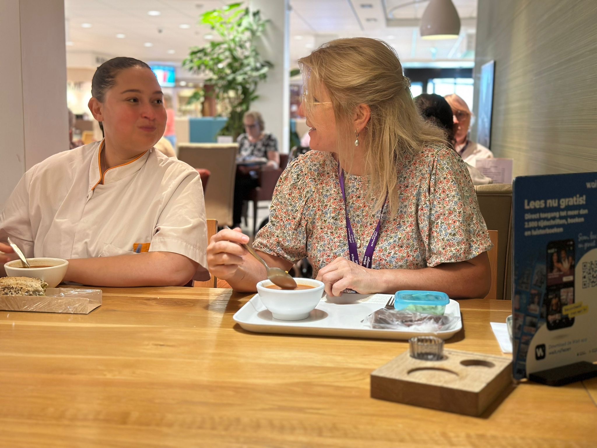 Lunchpauze! Samen met collega’s op de afdeling. Natuurlijk wordt het gesprek af en toe onderbroken door een belletje van een patiënt, maar dat hoort erbij.